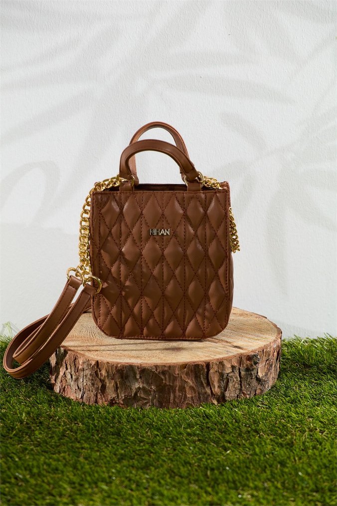 Ürün hiç kullanılmadı. Etiketlidir. Parlak kahverengi deri kadın çanta, zincir detaylı ve kapitone dikişli, trend sokak stili için uygundur.