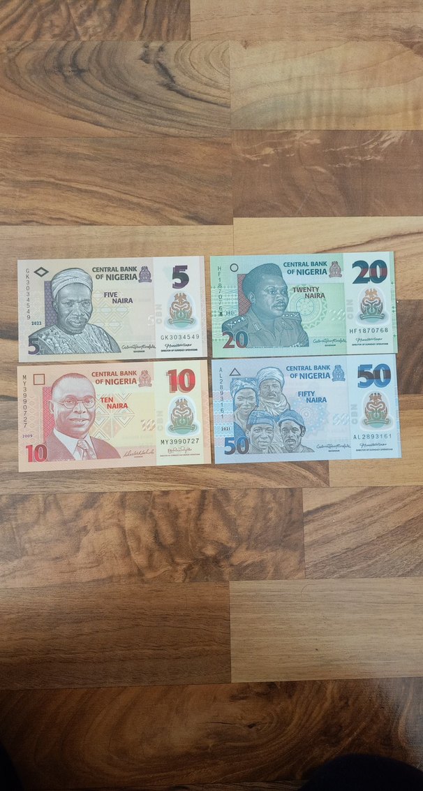 Nijerya'nın 5, 10, 20 ve 50 Naira banknotlarından oluşan renkli ve farklı portreli set.
