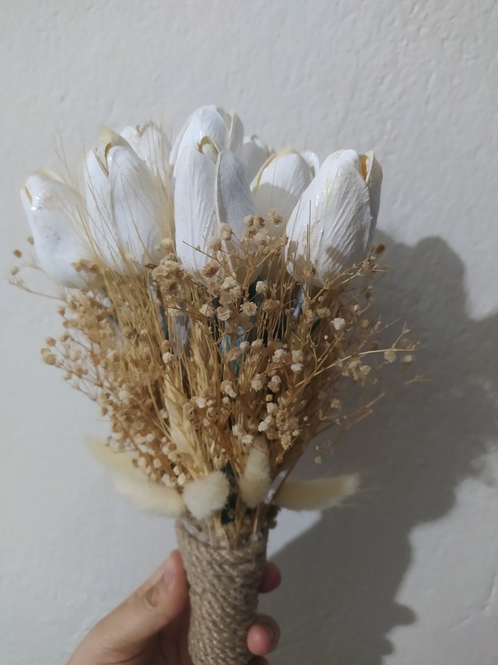 Beyaz çiçekler ve püskül detaylarıyla bohem tarzda, doğal kurutulmuş öğeler içeren, rustik ip ile sarılmış gelin buketi.