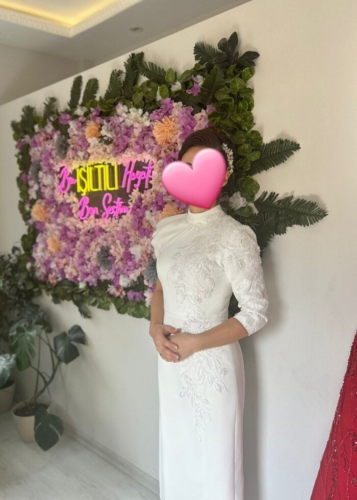 Nikah ve kutlama yemeğinde aynı gün giydim. İşlemeli, özel tasarım ve özel dikim. İçeride payı mevcut, daraltma yapılabilir.