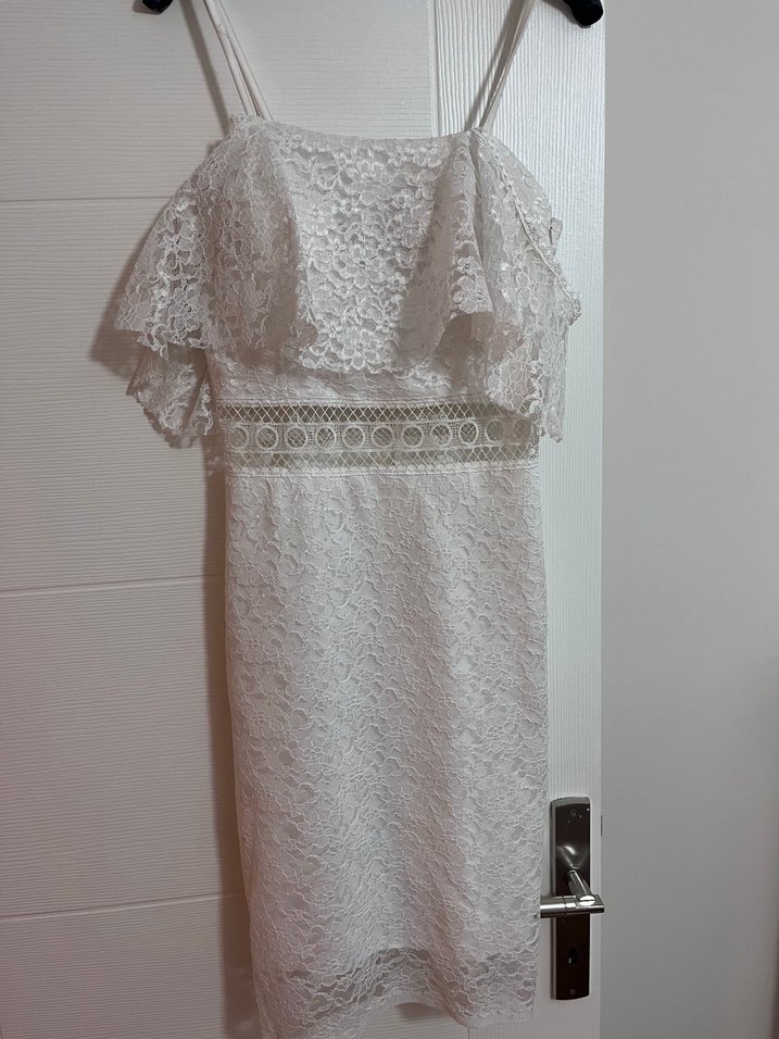 Dantel detaylı ve askılı kolları olan beyaz midi elbise. İşlemeli desenleri ve vücuda oturan kesimiyle nikahlar için uygun. Bir kere giyilip kaldırıldı. M beden.