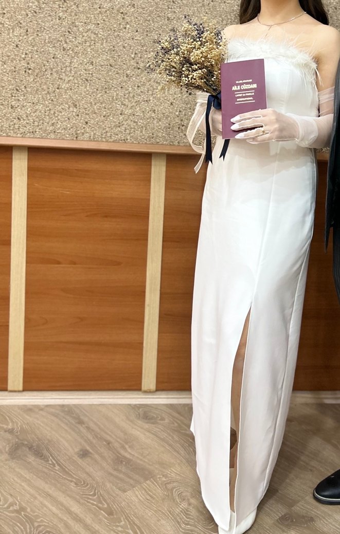 Modern klasik beyaz gelinlik, straplez yaka ve ince askılı kollara sahiptir. Düz kesim, normal oturuş ve ön yırtmaç detaylıdır.