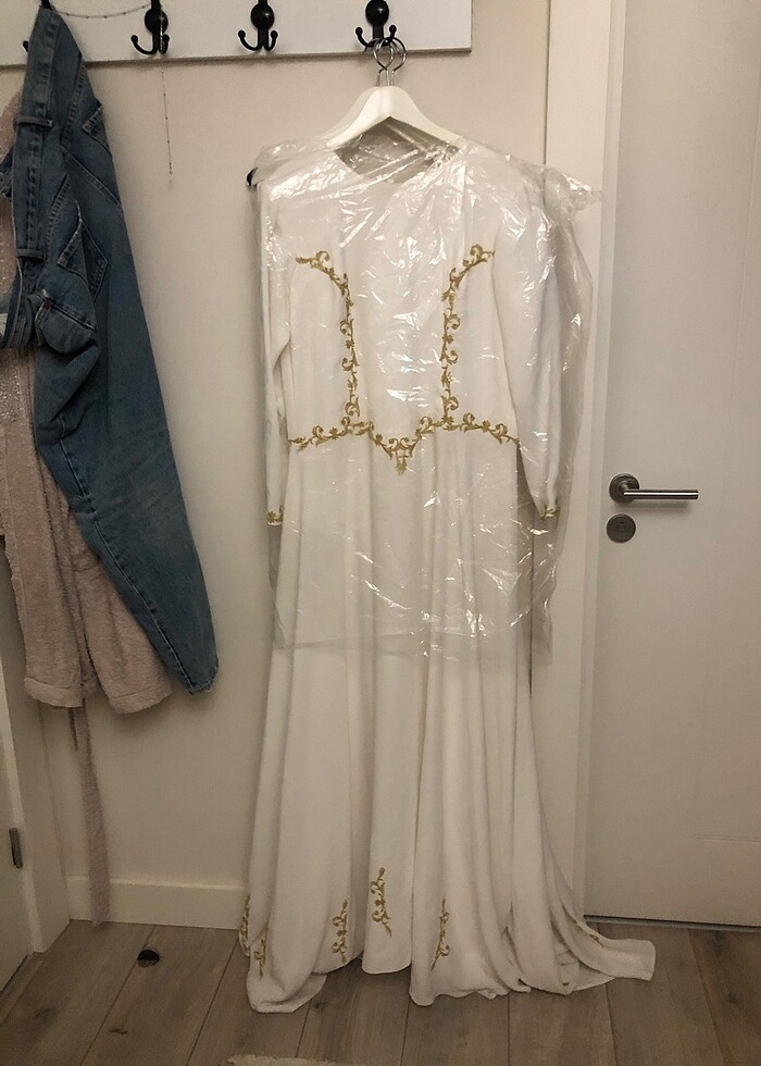 44-46 beden aralığı arkasında genişletmek için payı var. 1 kere giyildi. Özel dikim krepe kemik beyaz kumaş, gold detaylar isteğe göre çıkarabilir