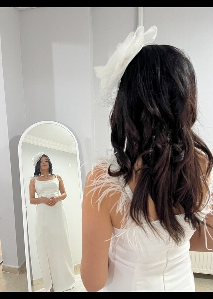 Nikah için almıştım askıyı sonradan ekledim asıl modeli straplezdir, yaka kısmındaki tüyleri söktüm kolay takılabilir elbiseyle birlikte gönderilecektir.1.75 boyuna göre uyarlanmıştır.