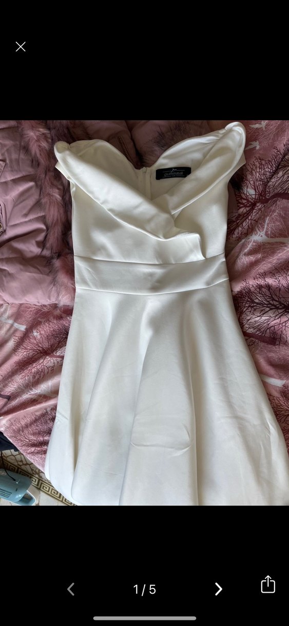 Beyaz straplez kadın elbise, drapeli yakası ve vücuda oturan kesimiyle modern klasik tarzda. Kolsuz ve midi boyda, düğünler için uygun. Nikahmda kullandım tek