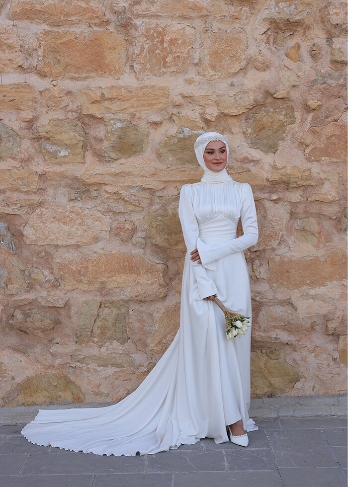 Elbiseyi nikah çekimimde giydim duvağıyla özel dikim yapıldı. Kumaş ismi mat saten olarak geçiyor, Şal olarak elbisenin kumaşını kullandım. Duvak düz tül ve uçlarına üç boyutlu çiçekler eklendi 36 beden için uygun. (Elbise,duvak,şal) birlikte gönderim sağlanacak.