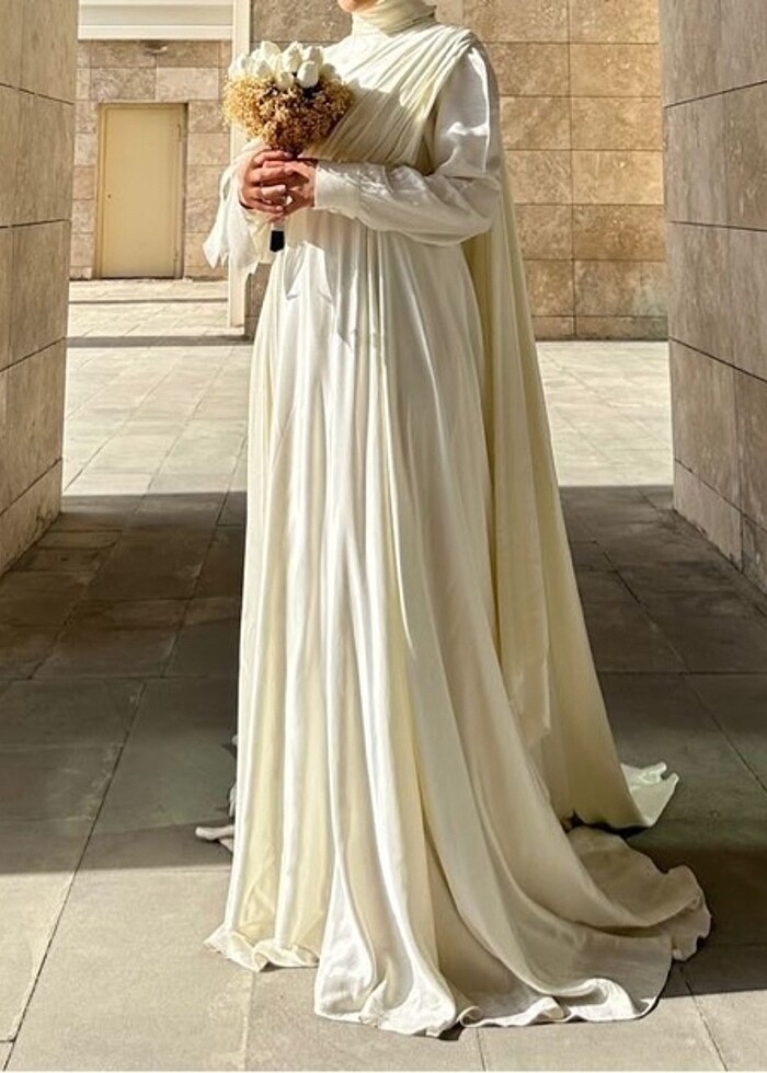 Nikahımda bir kaç saat kullandım. Saten ipek, pelerinli. Aynı kumaştan eşarbı mevcut. Özel dikim hazır almadım.