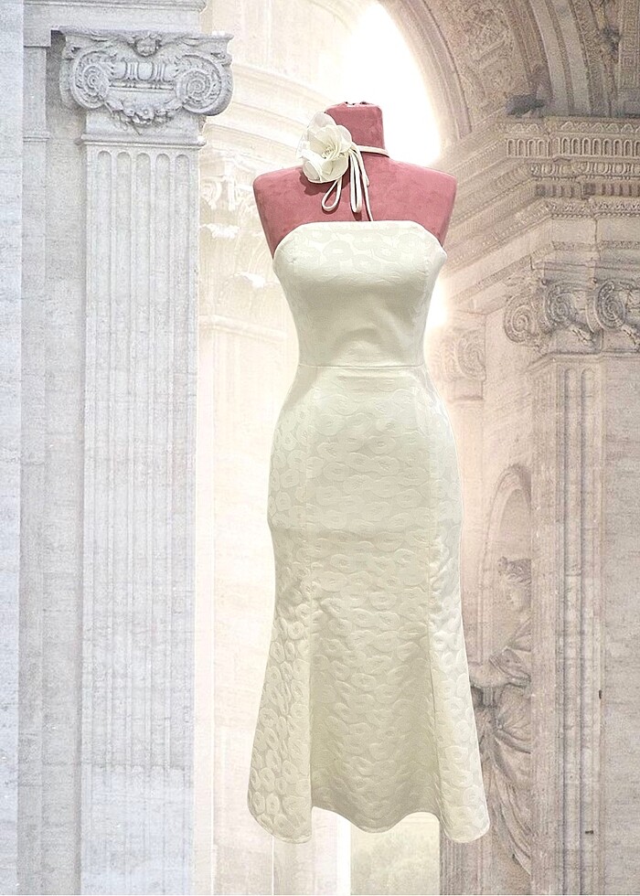 Boyun kurdelesi tasarımlı Straplez nikah elbisesi kendinden desenli kumaş Fermuar kapamalı K*ralık ya da satılık hiç giyilmedi