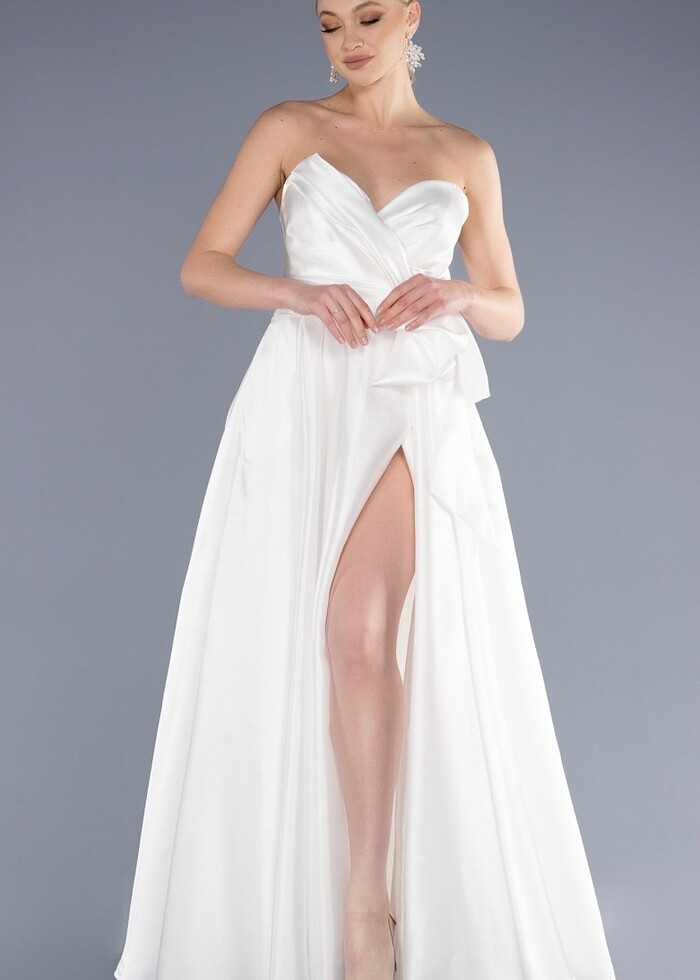 Strapless uzun yırtmaçlı elbise Dış çekimde giydim yırtmacı dize kadar kapatılmıştır 38 beden kalıp koltuk altlarından biraz daraltılmıştır