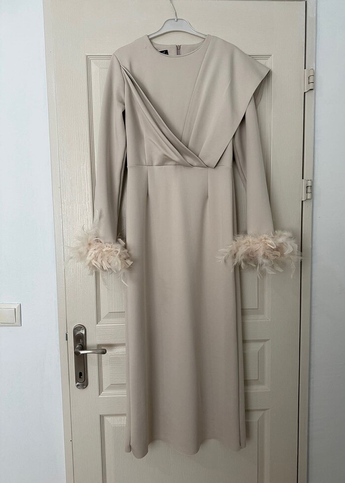 Ürün bir kez kullanılmıştır.Defo olarak sadece boyun kısmında hafif bir tüylenme olmuştur.Kolları tüy detaylı likralı krep kumaştır.Krem renk 40 bedendir.