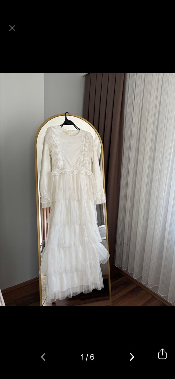 Fitted kesim, uzun kollu ve yuvarlak yakalı bu uzun elbise, nakış detayları ve fırfırlarla süslenmiştir. Keten kumaştan yapılmış, vintage tarzda ve düğün için uygundur. Hafif beyaz rengi klasik şıklık sunar.