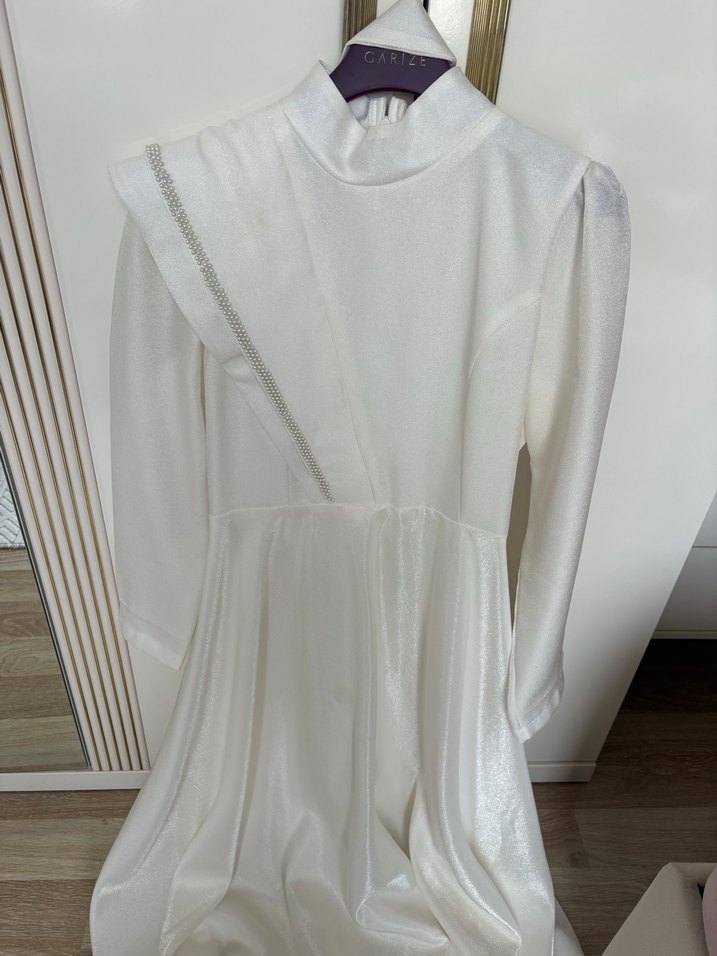 Yüksek yakalı ve uzun kollu, parlak sentetik kumaştan yapılmış beyaz uzun elbise. Drapeli tasarımıyla klasik ve avangart bir görünüm sunar. Düğünler için uygundur.