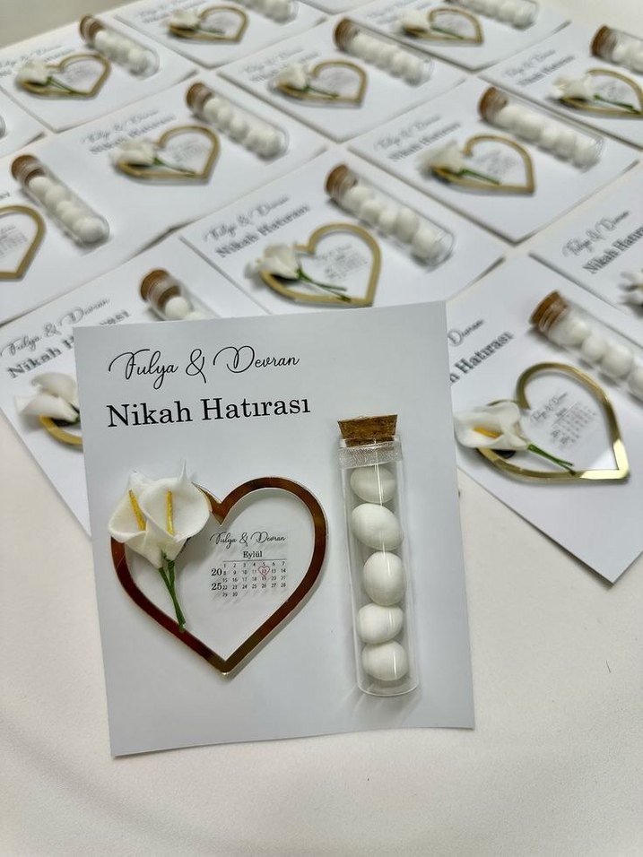 30 TL Beyaz nikah hatırası kartları, kalp tasarımı, küçük çiçek ve beyaz şekerli mini cam kavanoz içerir. "Nikah Hatirasi" yazılıdır.