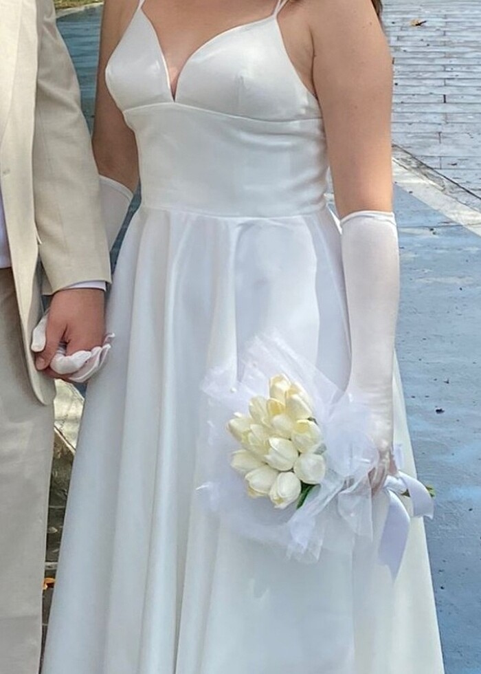 Sadece nikahımda giydim 1 saatliğine. Tangül's ali modaevinindir. Terziye arkasını ipli yaptırdığım için 36 38 40 bedene uyumludur. İsteyene eldiveni hediye edebilirim.