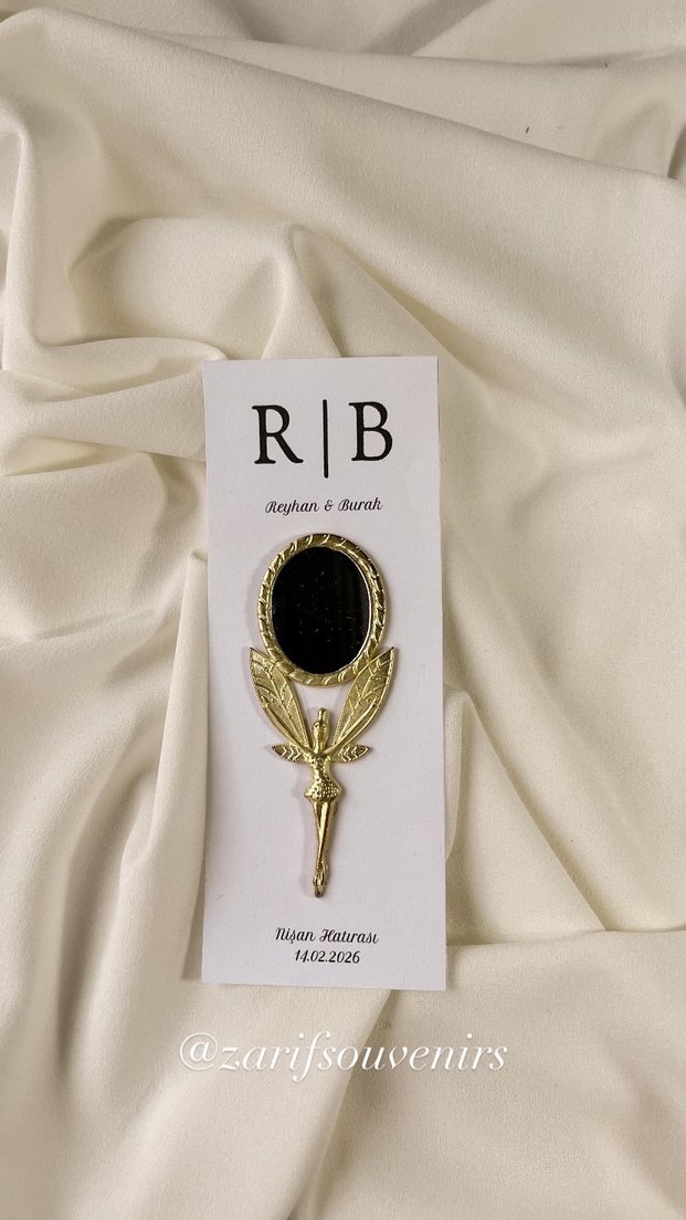 Altın renk çerçeveli, koyu renk yansıtıcı yüzeye sahip dekoratif ayna. Yaprak ve figür detaylarıyla şık bir tasarıma sahiptir. ✨ İsimlerinize özel tasarlanmış kart üzerine zarif hediyelikler detaylar ve sipariş için iletişime geçebilirsiniz✨