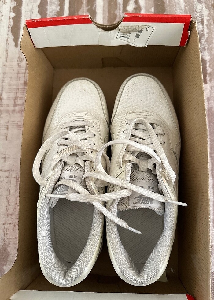 Yurtdışından alınmış özel seri yılan derisi görünümlü beyaz spor ayakkabı Orijinaldir, nike mağazasından alındı Düğünümde gelinlik altına giydim. Yağmurdan biraz kirlendiği için ucuza satıyorum. Nike Air Max white snakeskin
