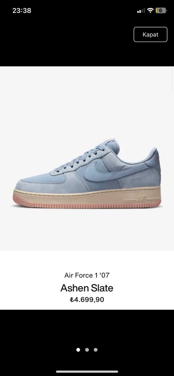 Nike Air Force 1 '07, pastel mavi renkte, kauçuk tabanlı ve desensiz tasarıma sahip. Spor ve gündelik şıklık için ideal bir ayakkabı. İki numara birden söyleyip iade süresini kaçırdığım için kutusuyla hiç giyilmemiş şekilde göndereceğim