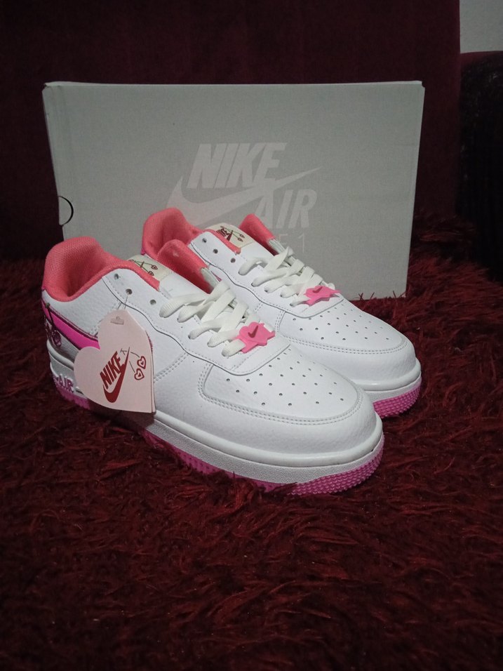 Nike Air kadın spor ayakkabısı, renkli pembe ve beyaz tasarımı, yüksek kauçuk topukları ve fırfır detaylarıyla sokak stili ve athleisure tarzını birleştirir.