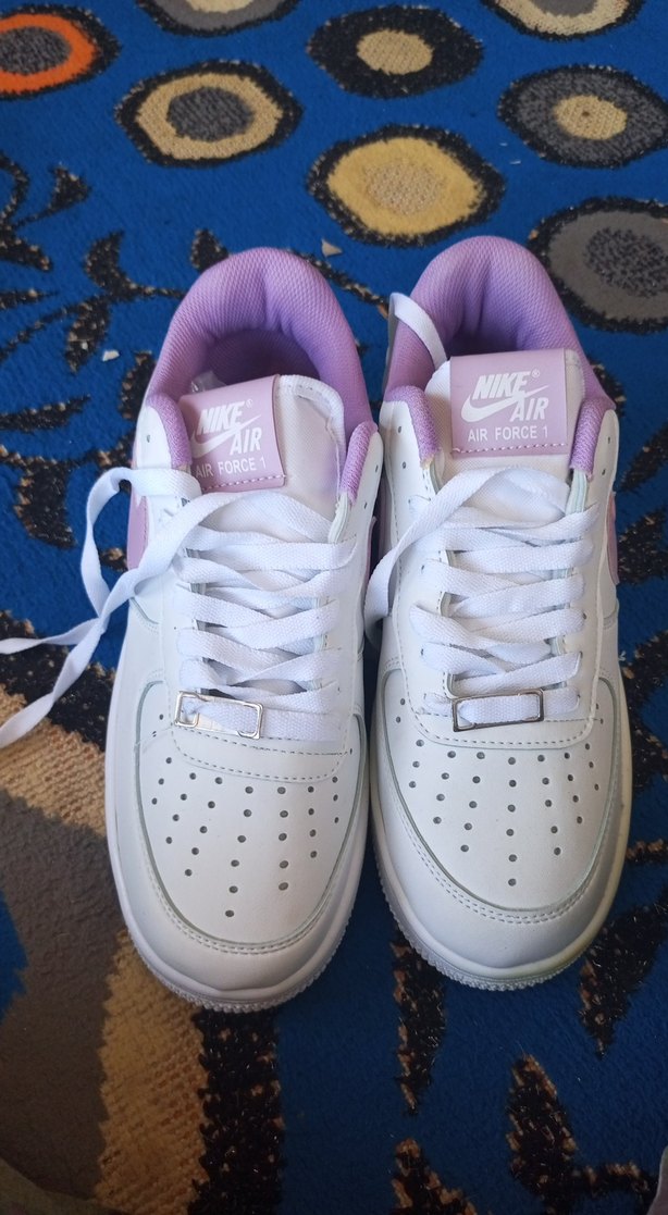 Nike Air Force 1, pastel mor detaylı, beyaz bağcıklı, düz tabanlı kauçuk spor ayakkabıdır.