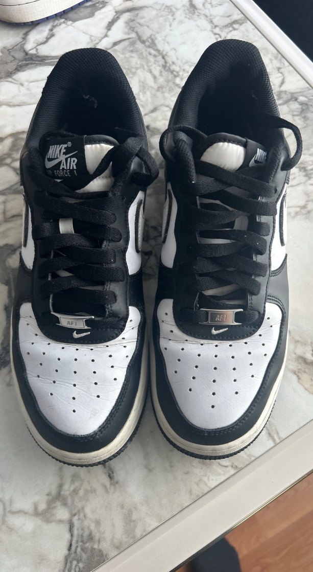 Nike Air Force 1 siyah beyaz spor ayakkabı, delikli burun kısmı ve markalı detaylarla klasik streetwear tarzı sunar.