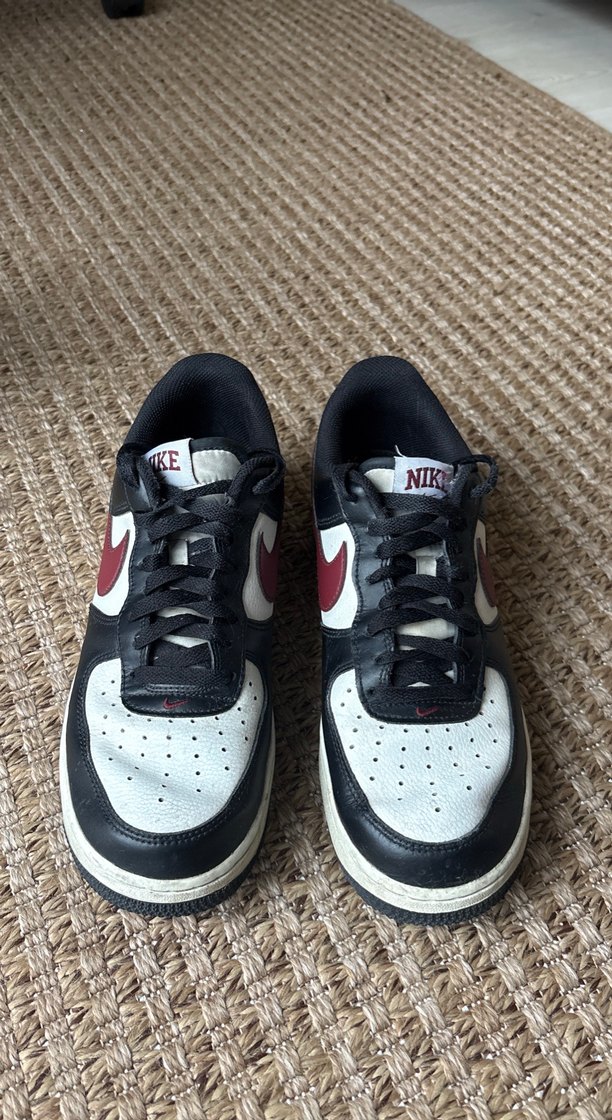 Nike air force, beyaz siyah ve bordo renklerde, düz tabanlı spor ayakkabısı. Spor ve günlük kullanıma uygun. Ürün temiz kullanılmıştır. Hiçbir kusuru yoktur. Orijinaldir. İstinye Park avm Nike mağazasından alındı.