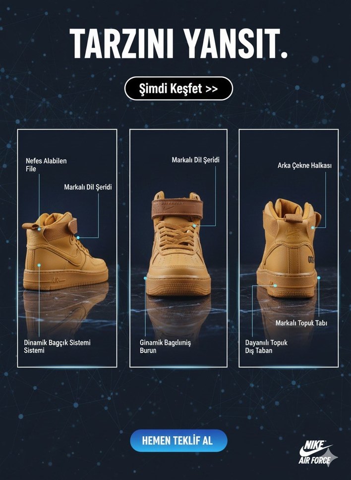 Nike Air Force erkek botları, parlak camel renkte, nefes alabilen file, dinamik bağcık sistemi, cırt cırtlı dil ve dayanıklı dış taban özelliklerine sahiptir.