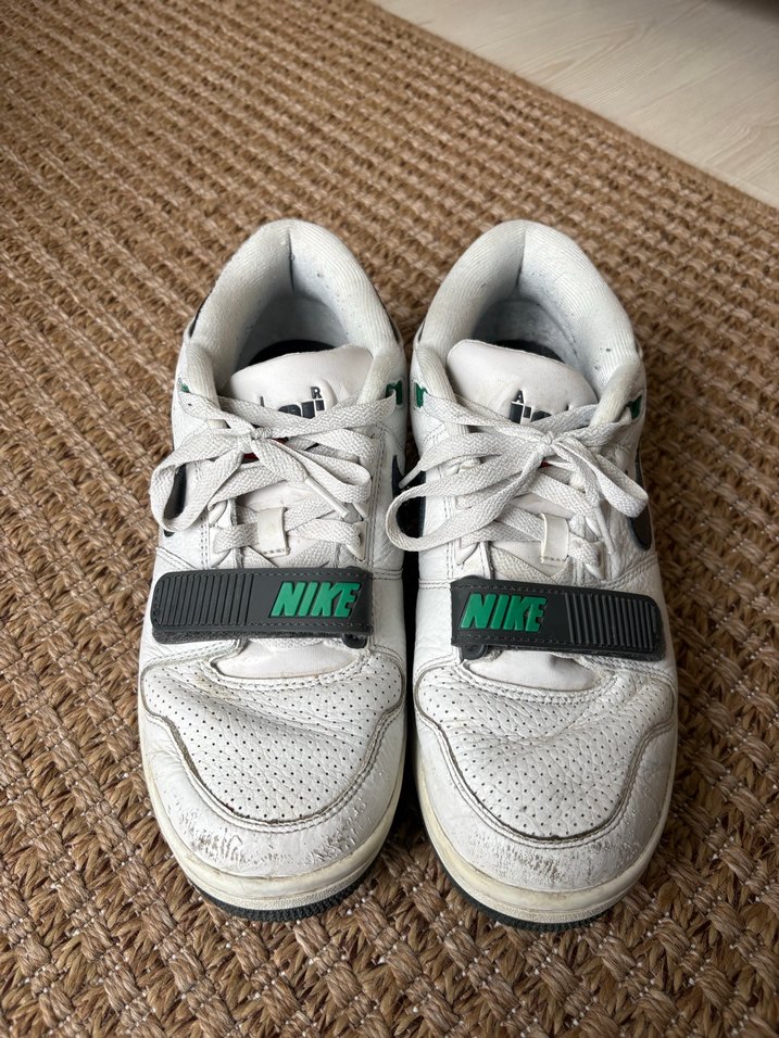 Beyaz ve gri tonlarında, delikli detaylara ve yeşil logo aksanlarına sahip Nike air force spor ayakkabısı. Sokak stili için uygun. Kocaeli 41 burada avm nike mağazasından alındı. Ürünün önünde kullanıma bağlı kılcal yıpranmalar mevcuttur fakat onların dışında hiçbir problemi yoktur.