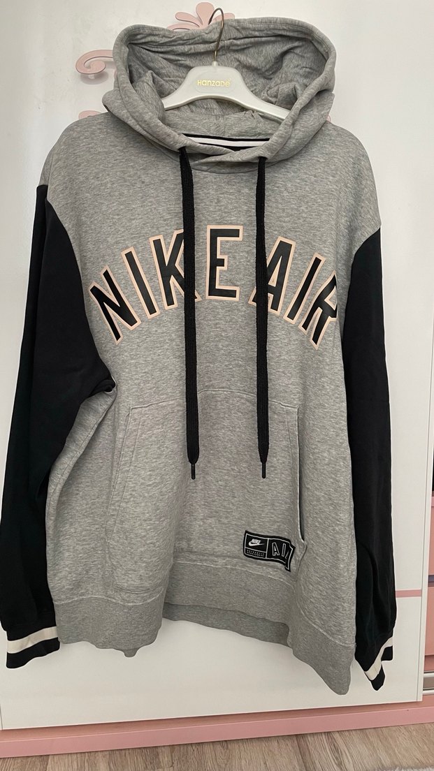 Gri ve siyah kollu, bol kesim Nike Air sweatshirt. Örme kumaş, bisiklet yaka ve baskılı logo ile spor tarzda rahat bir parça.