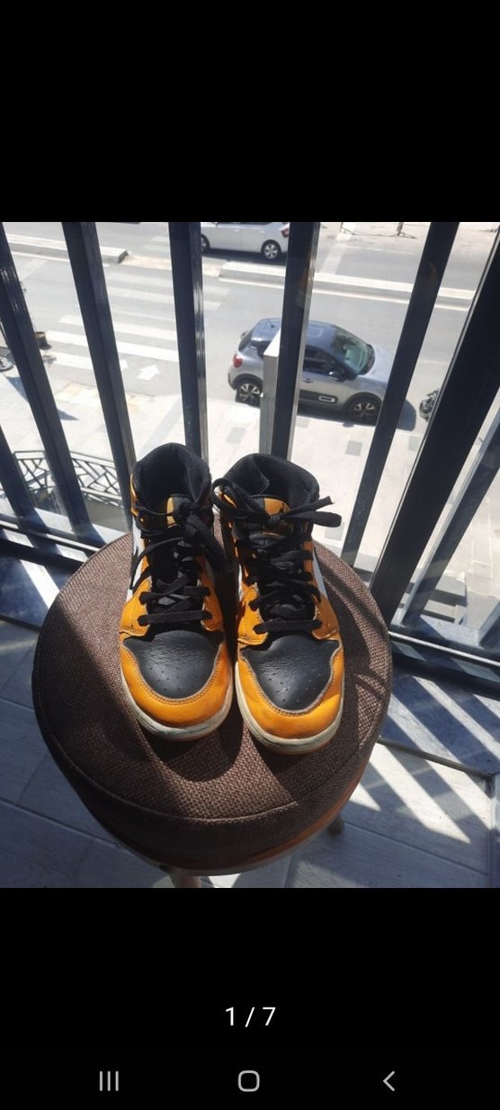 Sarı ve siyah bağcıklı basketbol ayakkabısı, kauçuk malzemeden ve tie-dye desenli. Spor ve trend günlük kullanım için uygundur.