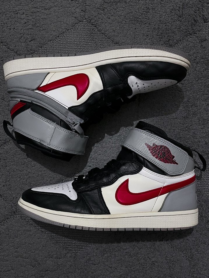 Nike Air Jordan 1 High FlyEase Black Particle Grey Gym Red. Fermuar ve cırt cırtlı yapısı sayesinde bağcık bağlama derdi olmadan çok kolay giyilen FlyEase teknolojili Jordan 1. Siyah, kırmızı ve gri renklerin uyumu harika. Çok az giyilmiş, burun kısmında okırılma minimaldir. #jordan #airjordan #flyease #jordan1 #nike #basketbol #sneaker #kırmızıjordan