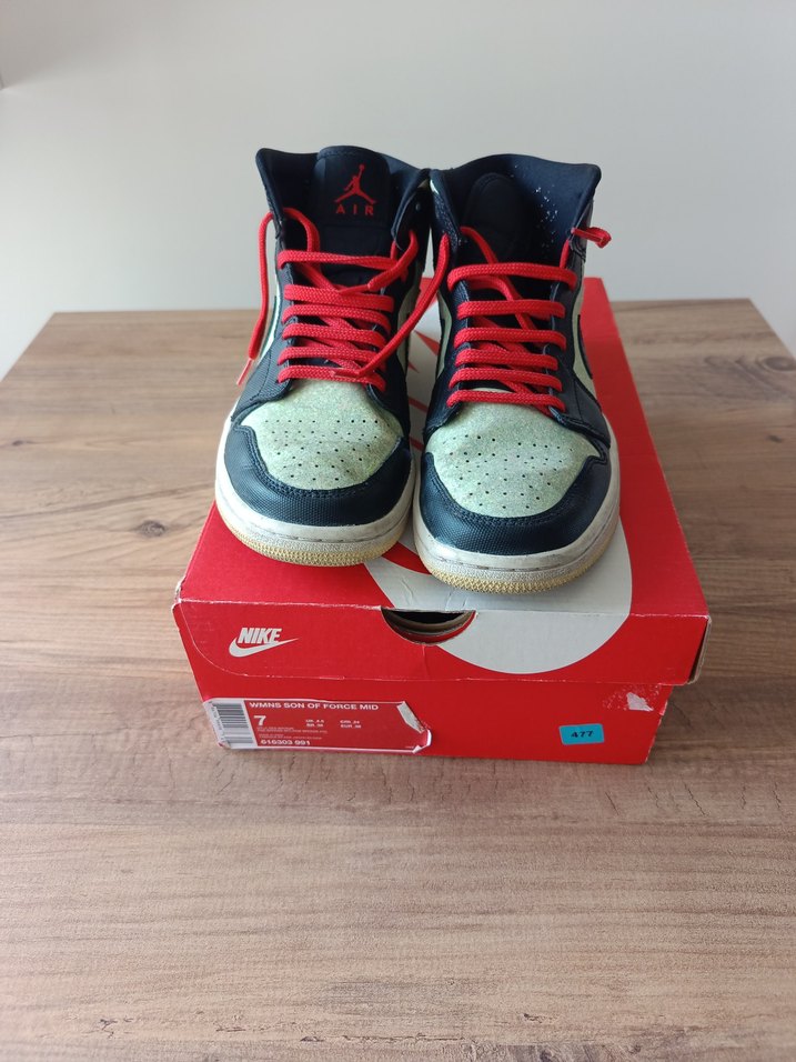Nike Air Jordan basketbol ayakkabısı, koyu renkli baskılı tasarım, kırmızı bağcıklar ve kauçuk taban ile sportif sokak stili için uygun.