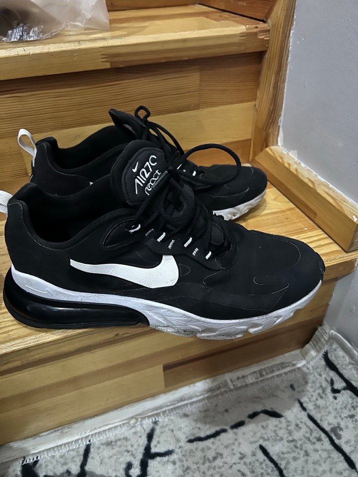 Nike Air Max 270 React siyah baskılı erkek spor ayakkabısı, bağcıklı ve kauçuk tabanlı, sportif sokak stili için uygundur. 44,5 numara