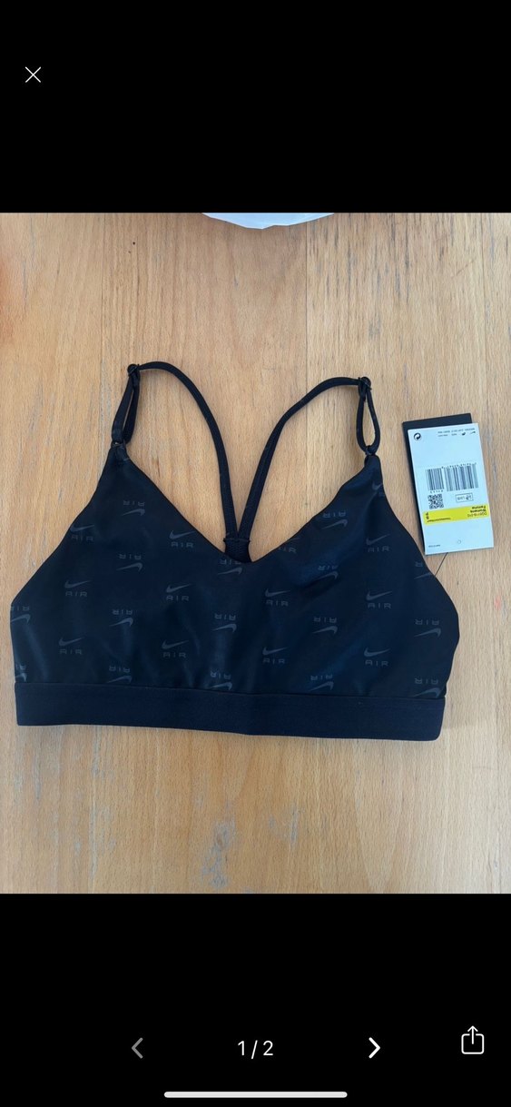 Nike air kadın pedsiz spor büstiyer yeni ve etiketlidir Ayarlanabilir askılı, baskılı desene sahip siyah spor sütyeni. Streetwear ve athleisure tarzlarına uygun, rahat ve destekleyici.