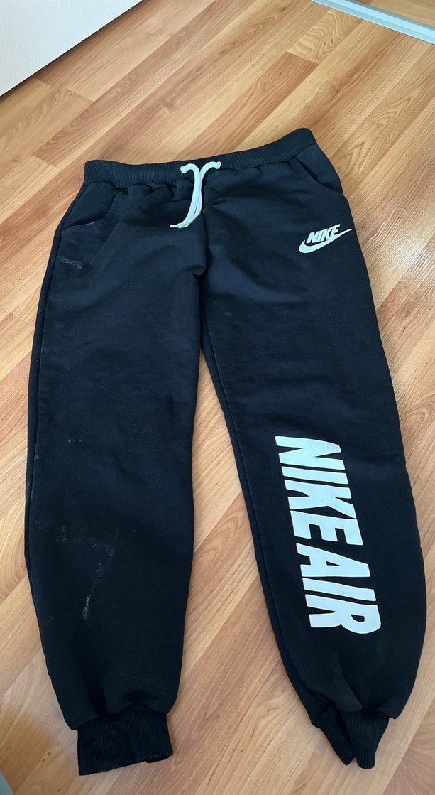 Nike Air marka, siyah renk, bol kesim kadın eşofman altı. Fermuarlı cepler ve yumuşak, sıcak tutan kumaş içerir. Spor ve günlük kullanım için uygundur.