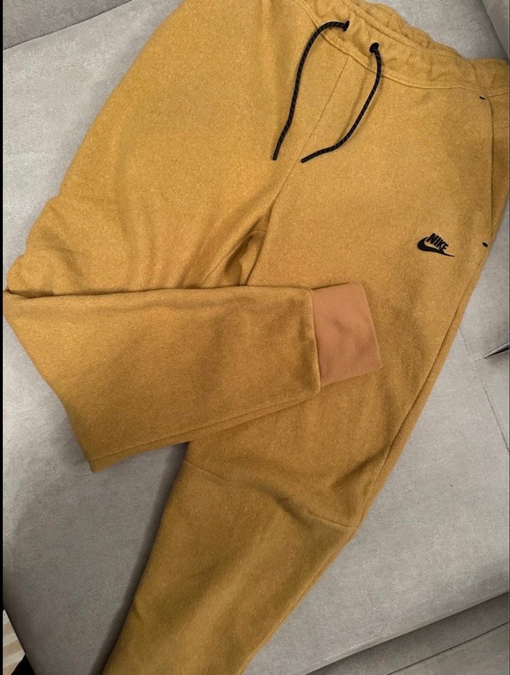 Nike sarı eşofman altı, bağcıklı bel ve rahat ribanalı paçalar ile. Sol tarafta Nike logosu bulunur. Kalın ve kışlıktır.