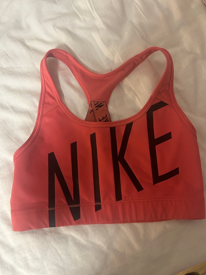 Nike markalı koyu pembe spor sütyeni, baskılı detaylı ve sırtı racerback tarzında, streetwear ve athleisure için uygun. ♀️