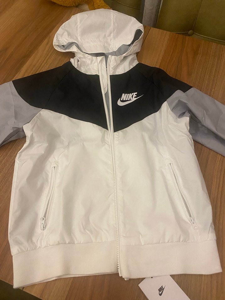 Nike marka, beyaz ve gri tonlarda, fermuarlı cepli, kapüşonlu ve yüksek yakalı erkek rüzgarlığı. Spor ve şık görünüme uygun, normal boyda ve dar kesim. % 100 orijinal