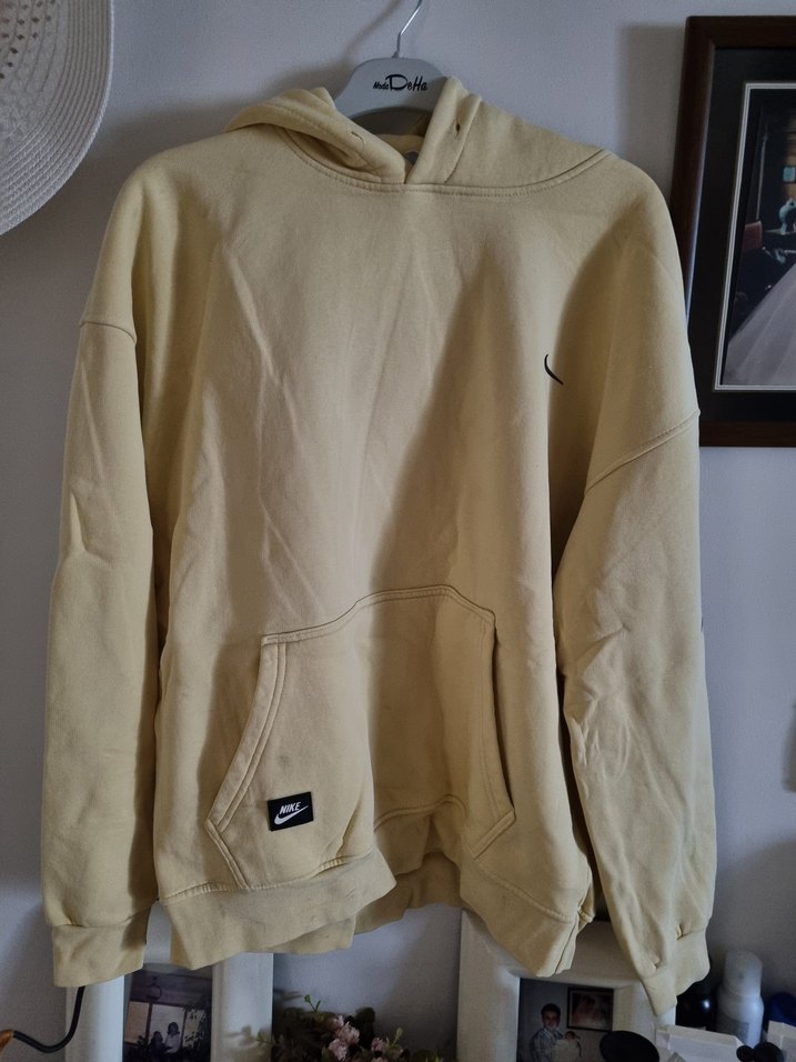 Nike sweet sarımsı makul ürün küçük lekesi var resimde gösterdim.Bej renkte, kapüşonlu, uzun kollu ve rahat kesim sweatshirt. Yumuşak ve sıcak kumaştan, ön cep ve ince logo detaylarıyla günlük kullanıma uygun.