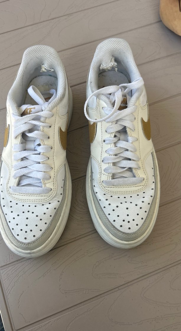 Nike markalı, bağcıklı, düz tabanlı beyaz kadın spor ayakkabısı, günlük kullanım ve rahat sokak stili için uygun.