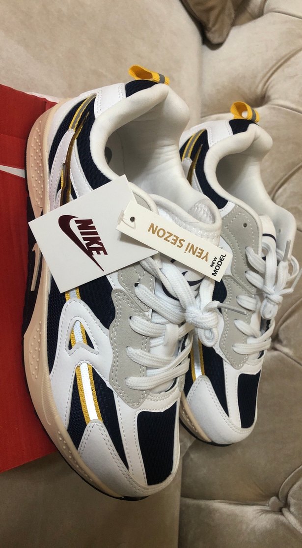Nike beyaz bağcıklı 43 numara spor ayakkabısı, baskılı desen ve stilettolu topuklu. Kauçuk malzemeden, spor ve sokak stiline uygun. Pazarlık payı vardır