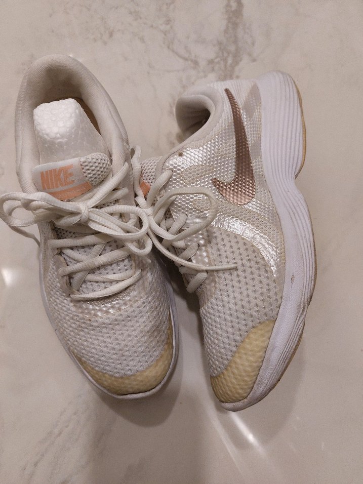 Nike beyaz bağcıklı kadın spor sneaker, ince topuklu ve kauçuk tabanlı. Spor ve sokak stili için uygun, hafif ve desensiz tasarım.