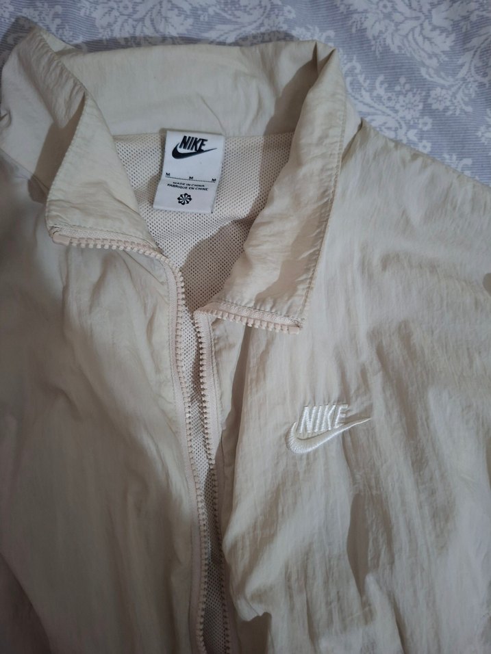 Nike beyaz ceket, fermuarlı ve bol kesimdir yuvarlak yaka ve midi boydadır, sokak stili ve athleisure için uygundur. ️