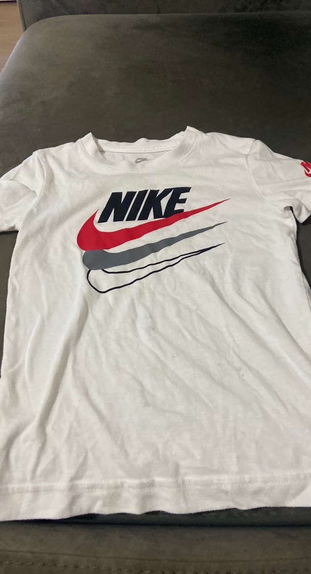 Pamuk kumaştan, kısa kollu ve bisiklet yaka kesime sahip, beyaz renkli ve Nike baskılı erkek çocuk tişörtü. Rahat ve şık bir sokak giyim parçası.