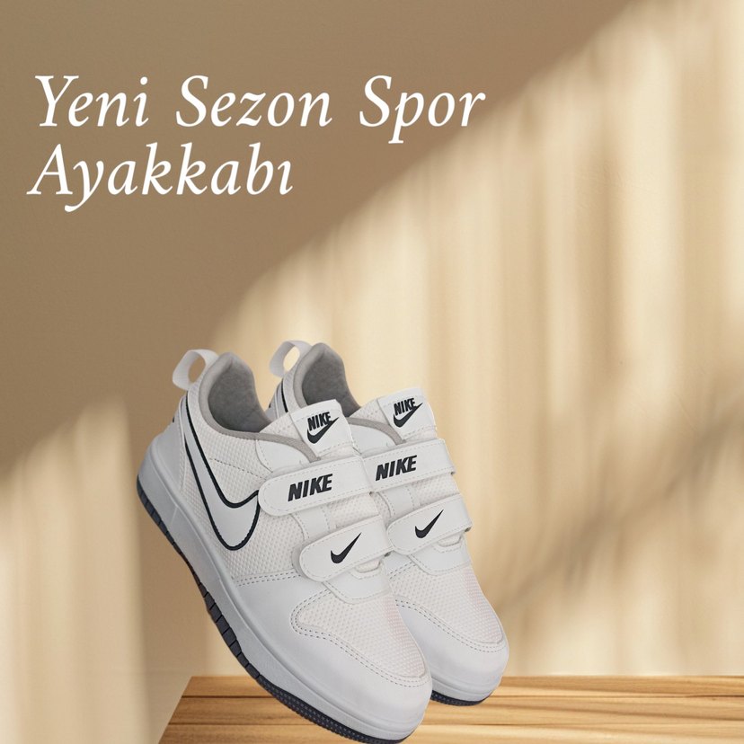 Nike markalı, beyaz renkli erkek çocuk spor ayakkabısı. Baskılı detaylı, cırt cırtlı ve kauçuk tabanlıdır.