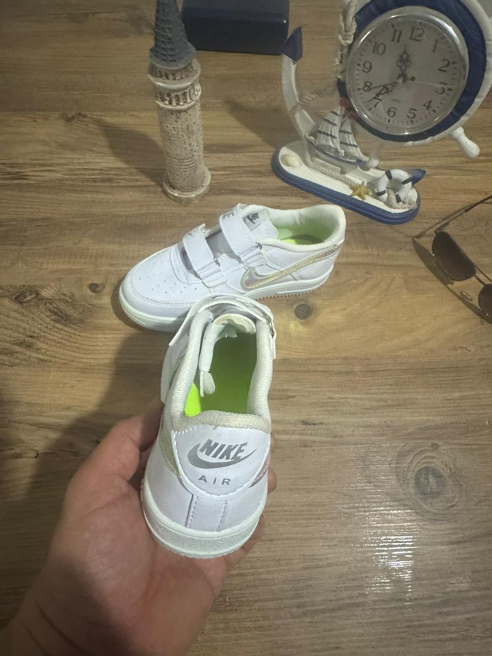 Nike marka beyaz renk erkek çocuk spor ayakkabısı, velcro bantlı ve kauçuk tabanlı. Sokak stili için sade ve açık renkli tasarım. AIR yazısı mevcut.