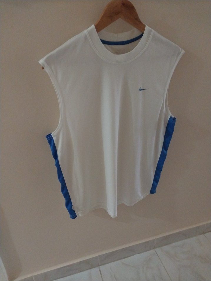 Mavi yan detaylı, bol kesim kısa beyaz kolsuz atlet. Rahat athleisure tarzı için uygundur. Göğüste küçük Nike logosu bulunur. ⚪orijina bedeni silik M bedenl