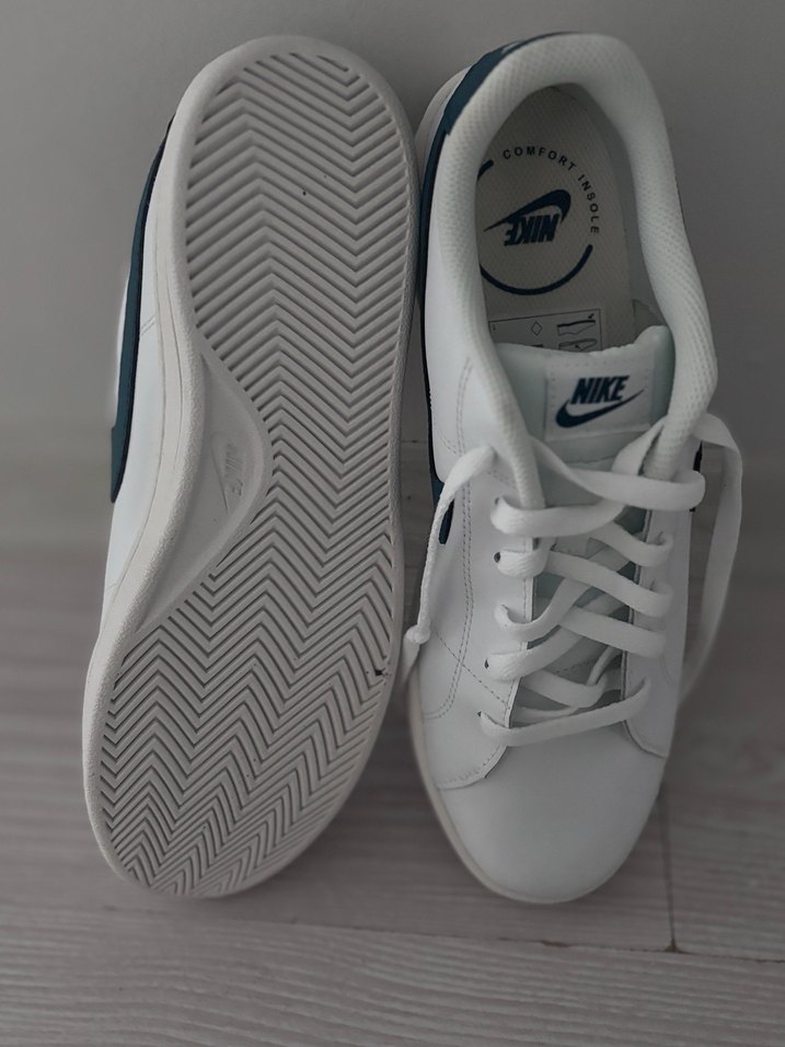 Nike beyaz erkek spor ayakkabısı, dolgu topuklu ve bağcıklı tasarıma sahip, gri tabanlı. Spor sokak giyimi için uygun.