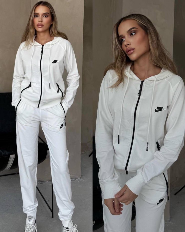 Nike markalı, fermuarlı ve uzun kollu beyaz kadın eşofman takımı. Yumuşak ve hafif kumaştan, günlük kullanıma uygun rahat kesim. ♀️