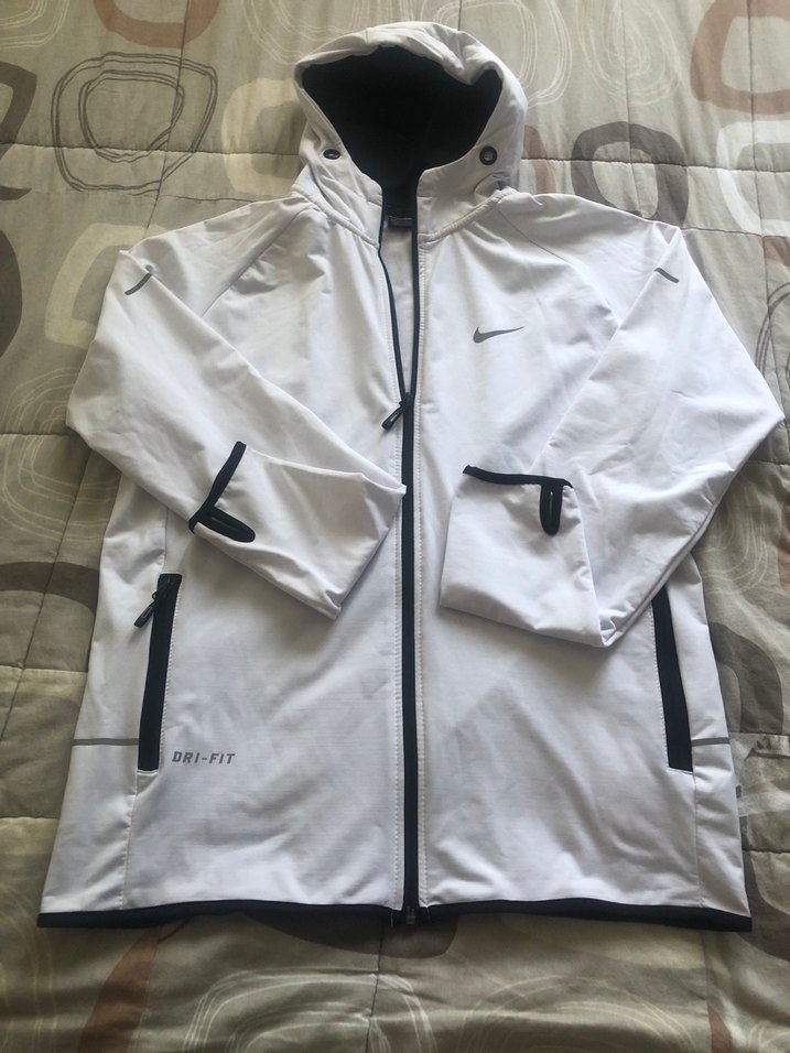 Nike markalı, beyaz renkli, fermuarlı ve yüksek yakalı erkek yağmurluğu. Yumuşak kumaştan, uzun kollu ve günlük kullanıma uygun. Orjinal değildir dalgıç kumaş en 55cm boy 70cm