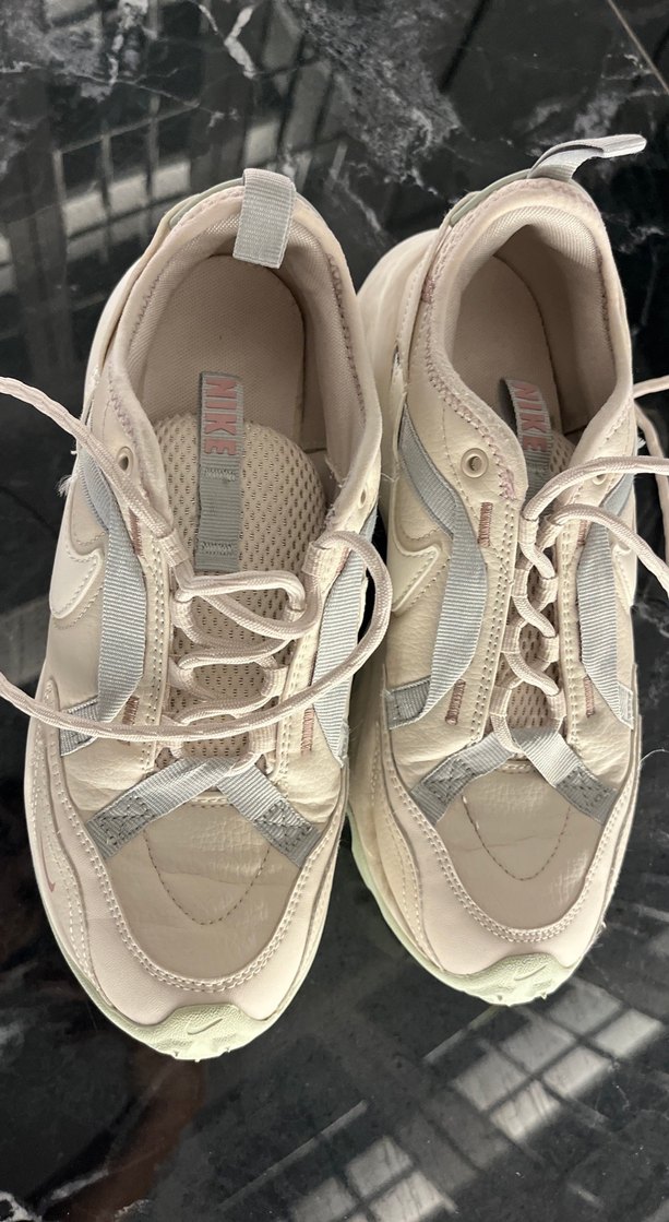 Nike marka beyaz ve gri tonlarda, bağcıklı ve dolgu topuklu kadın spor ayakkabısı. Dayanıklı kauçuk tabanlı, spor ve sokak stiline uygun.